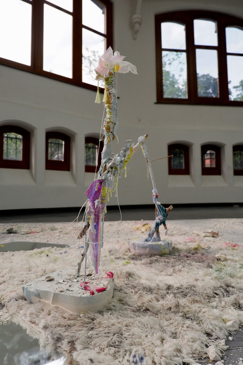(Textile, plaster, stones, branches, clay, paint, plastic, fake gems & pearls, shards, mirror / Dimensions: 500 x 400 cm)